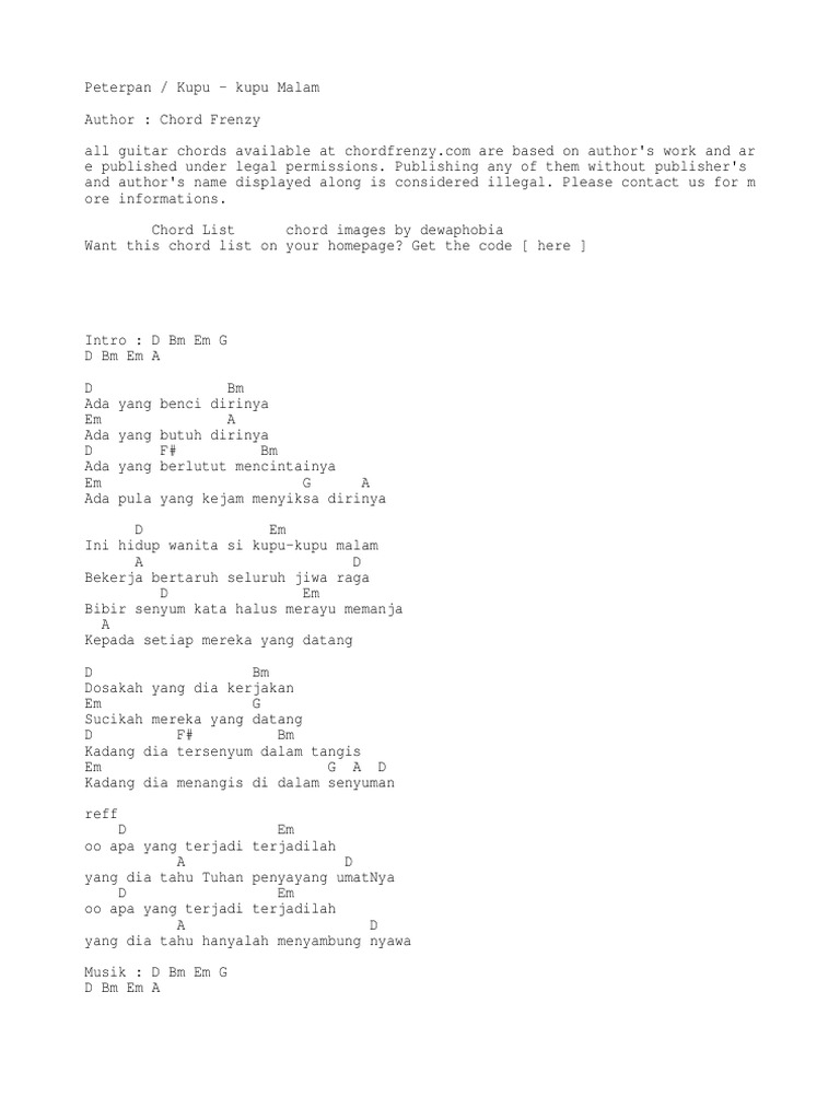 Bila tidak berhasil, coba untuk mengilangkan tanda kutip, misal: Andai kau telah lelah berhentilah dulu bukan satu jalan hidupmu. Chord kunci gitar peterpan kupu kupu malam. Chord peterpan kupu kupu malam lirik lagu lengkap terbaru. Oh peragawati mengapa diam membisu?